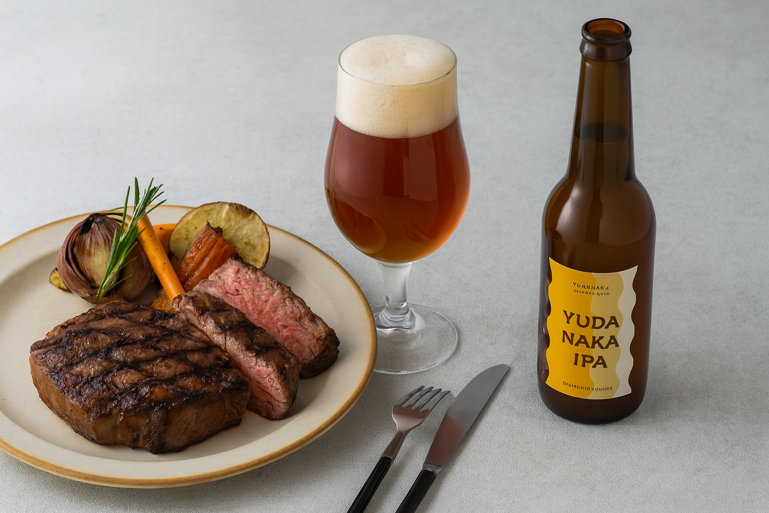 【お食事】ステーキ、ハンバーグ、豚の角煮(しっかりとした苦味とボディが、肉の脂や濃い味付けをリセットし、次の一口を美味しくさせます。)
