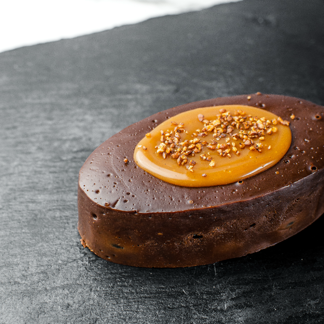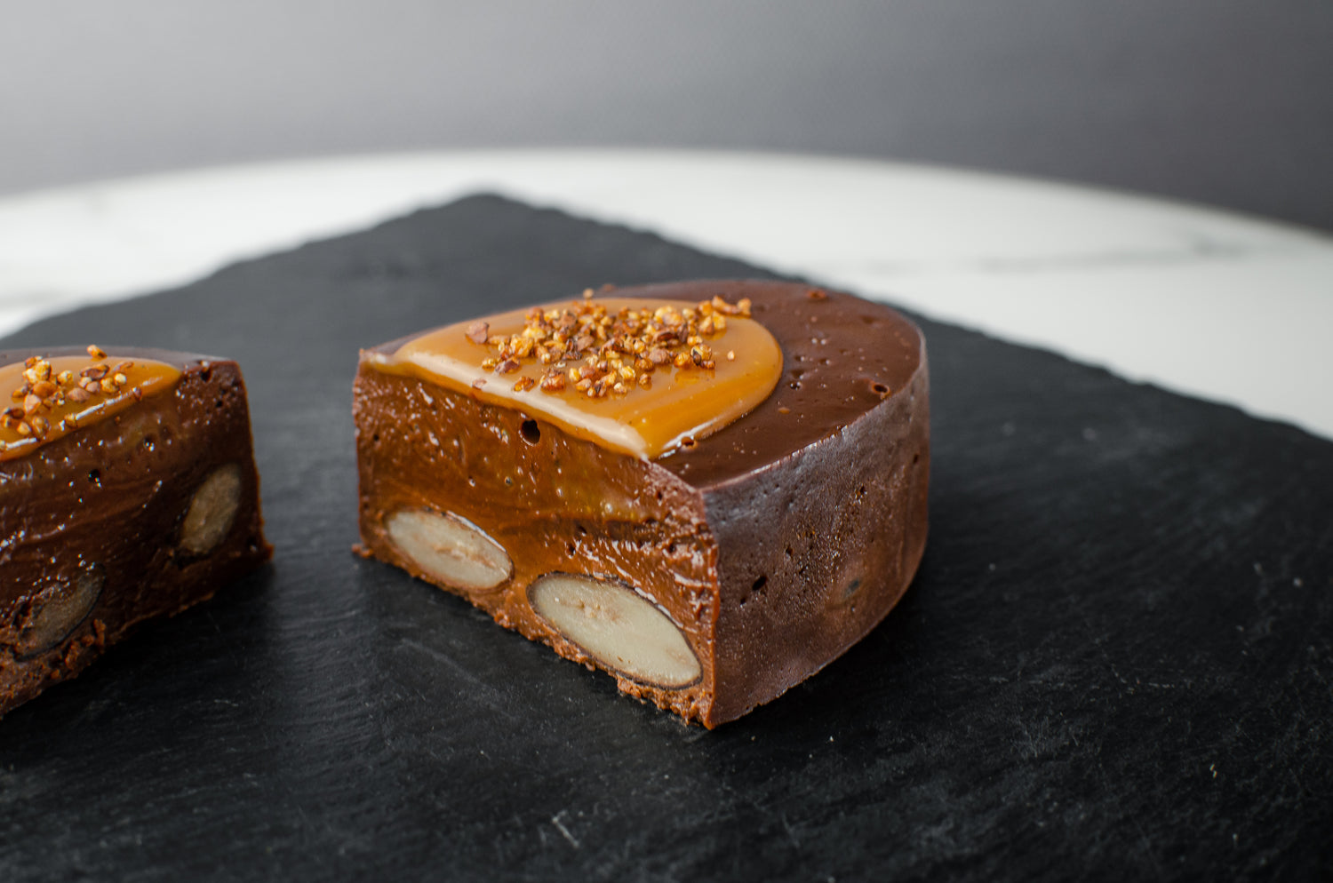 なめらかなテリーヌと濃厚なカカオの味わいを存分にお楽しみいただけます。中に加えた長野県産の紫花豆は、しっかりとした食感を持ち、塩が甘みを引き立てて味に深みを加えます。上部には甘めのキャラメルソースと、食感にアクセントを加える蕎麦の実を散らし、多彩な味わいが広がります。
