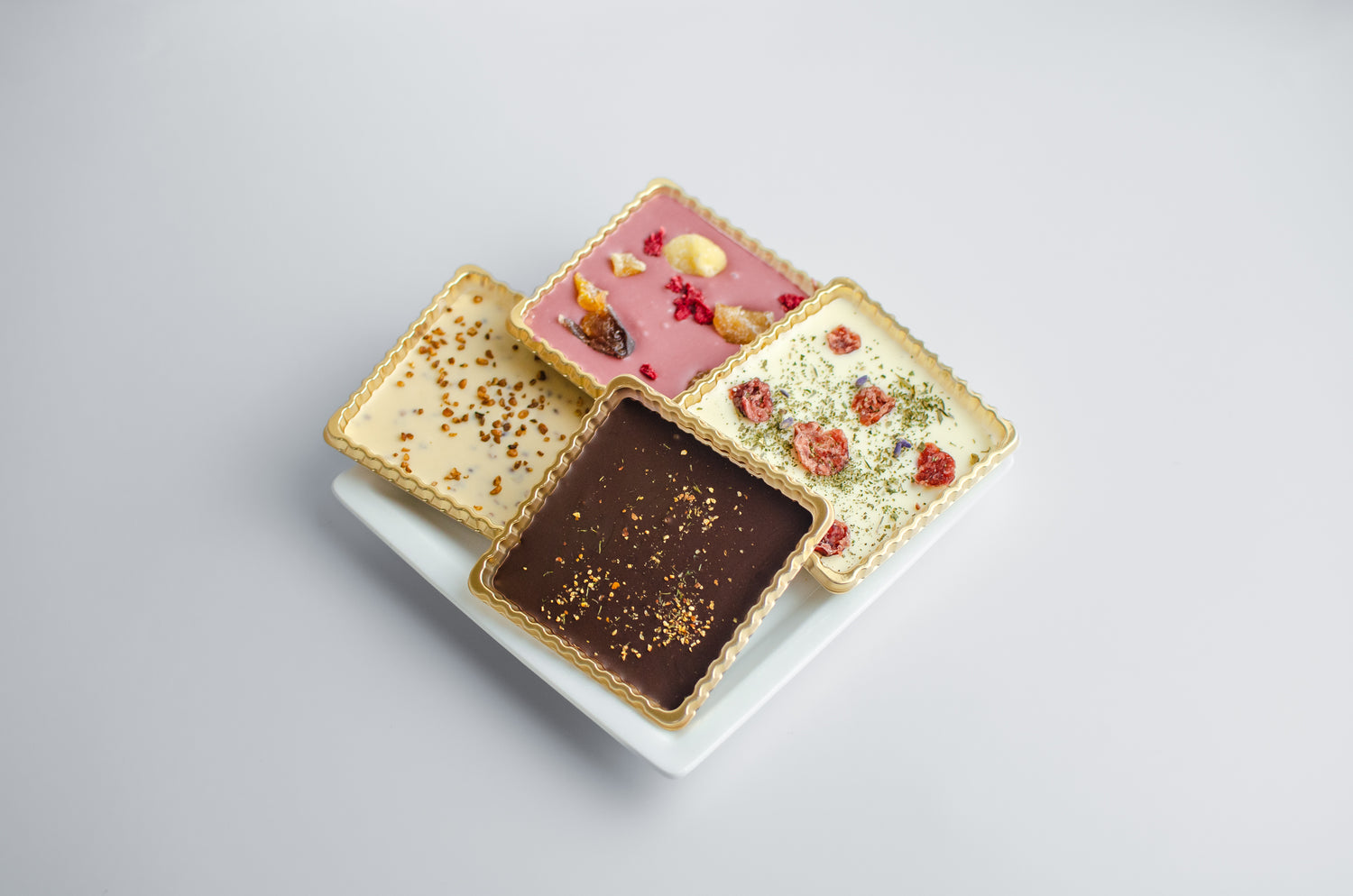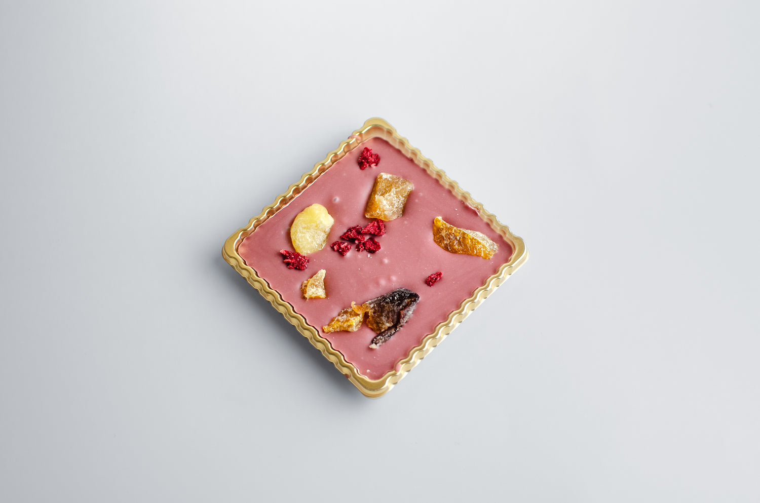 鮮やかなルビーチョコレートに、長野県産の白桃やすももなど、ドライフルーツをふんだんに使用。フランボワーズの華やかな酸味とドライフルーツの甘さがマッチし、果実の豊かな風味を堪能できる逸品です。