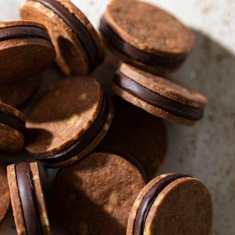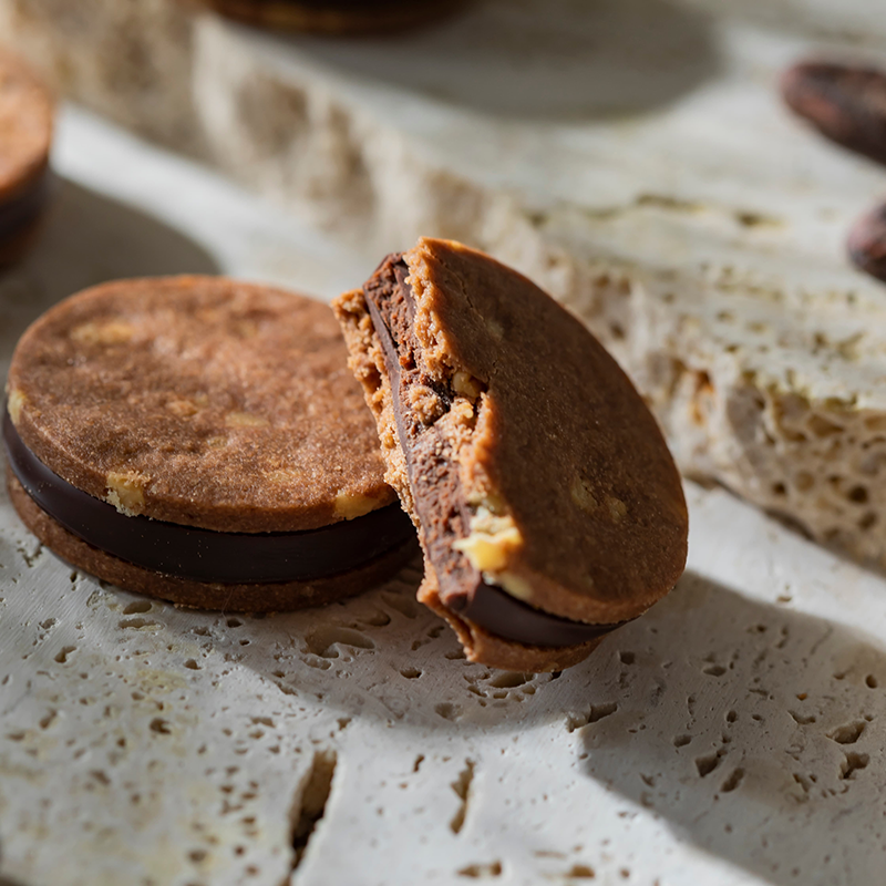 口当たりなめらかな温度で仕上げた濃厚なチョコレートガナッシュを、香ばしい自家製クッキーでサンドしたoN CHOCOLATE NAGANOのメイン商品です。カカオの豊かな風味を存分に楽しめるガナッシュが、贅沢なひとときを演出する上質なチョコレートサンドです。