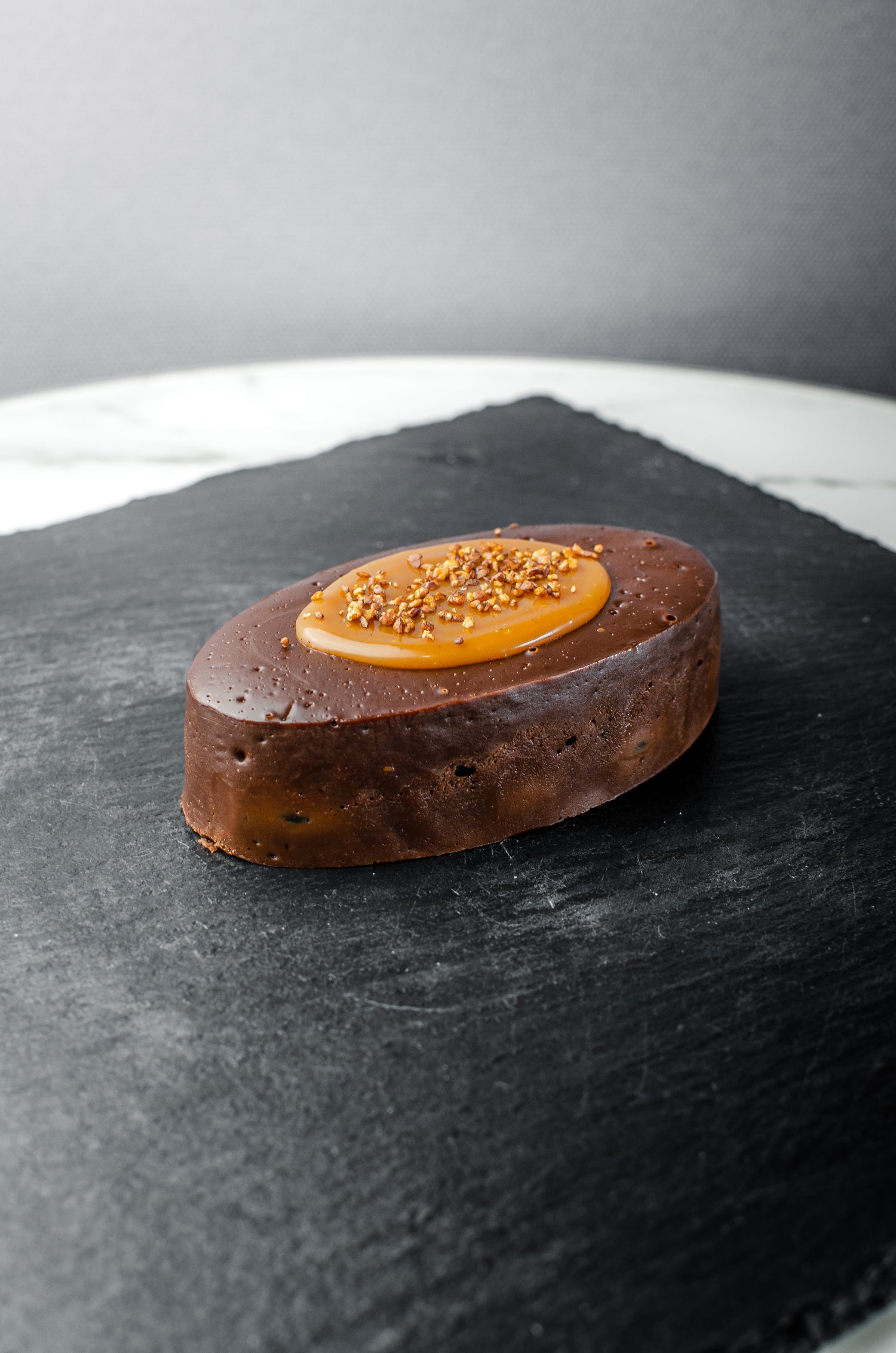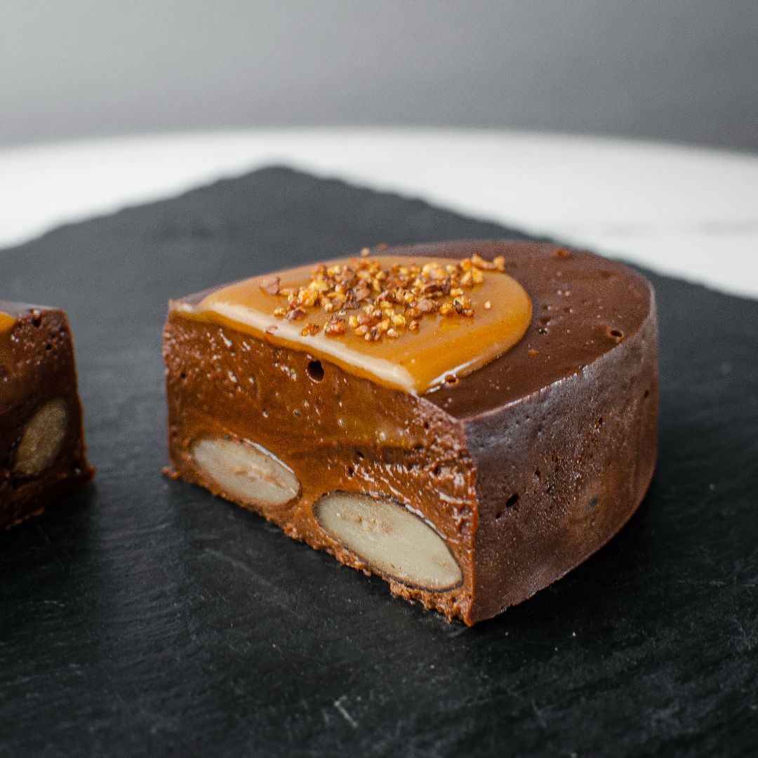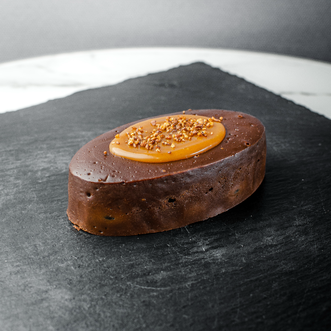 なめらかなテリーヌと濃厚なカカオの味わいを存分にお楽しみいただけます。中に加えた長野県産の紫花豆は、しっかりとした食感を持ち、塩が甘みを引き立てて味に深みを加えます。上部には甘めのキャラメルソースと、食感にアクセントを加える蕎麦の実を散らし、多彩な味わいが広がります。