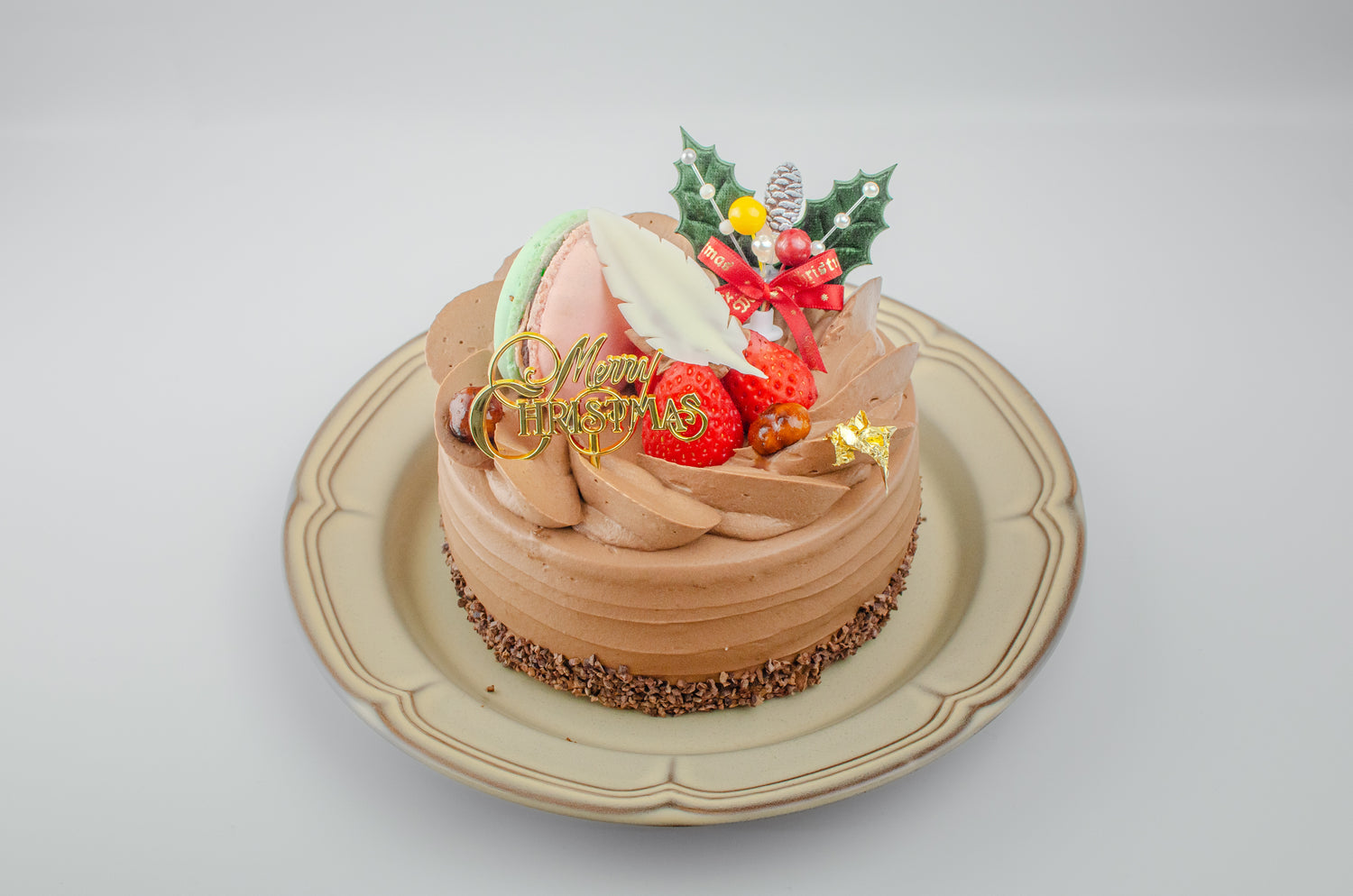 ベリーズ産カカオ豆のビーントゥーバーチョコを贅沢に使用した、濃厚で香り高いクリスマスショコラケーキ。 ふんわりとしたジェノワーズショコラに、ヘーゼルナッツのキャラメリゼやチェリーのシロップ漬け、シャンティショコラ、ビスキュイサッシュを重ねた贅沢な層仕立て。 トップには苺やマカロン、ホワイトチョコの羽根飾りを添え、華やかで心ときめく味わいに仕上げました。